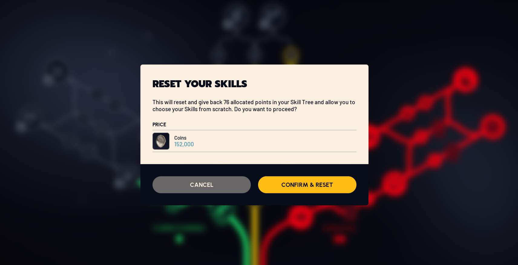 152,000コインで76スキルポイント全部を初期化して、最初から振り直せるようになった。